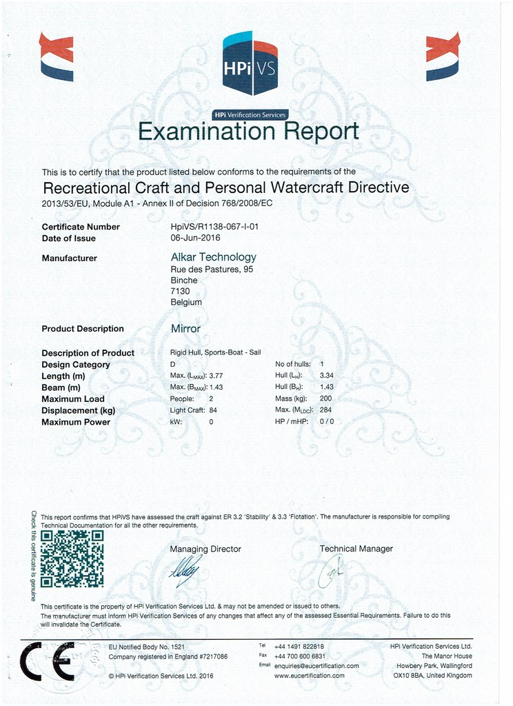 La conformité CE atteste que le bateau remplit les conditions minimum de sécurité, essentiellement en matières de flottabilité et de stabilité. Des tests complets ont été effectués en présence de l'inspecteur de HPI au lac de l'Eau d'Heure (B) en mai 2016.